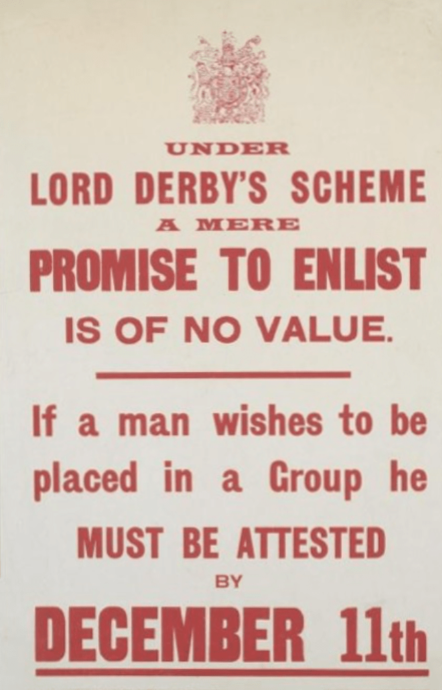 Derby Scheme poster from November 1915. Salisbury Plain
